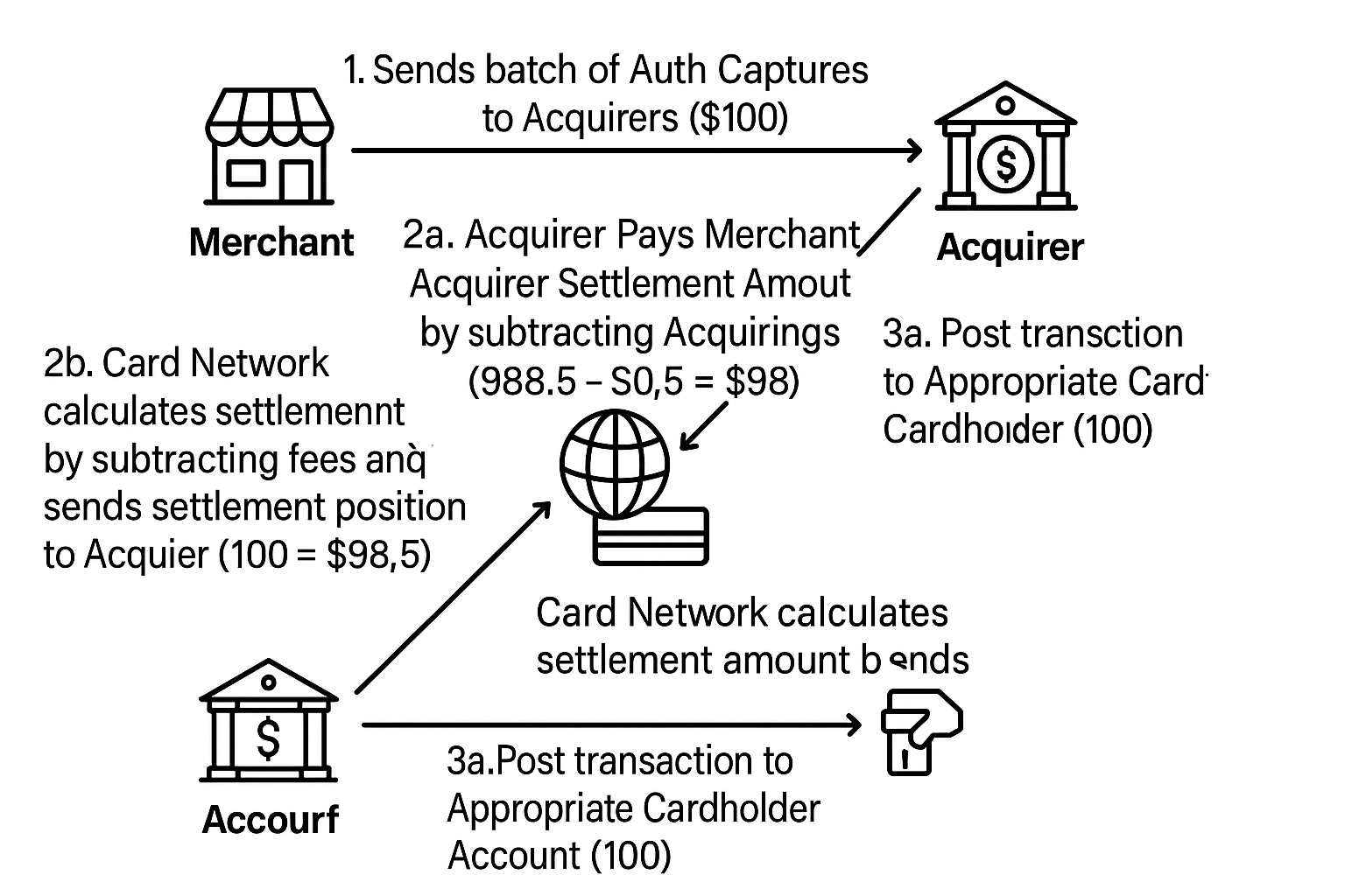 2b. Acquirer pays Merchant $97 (after acquiring fee deduction).